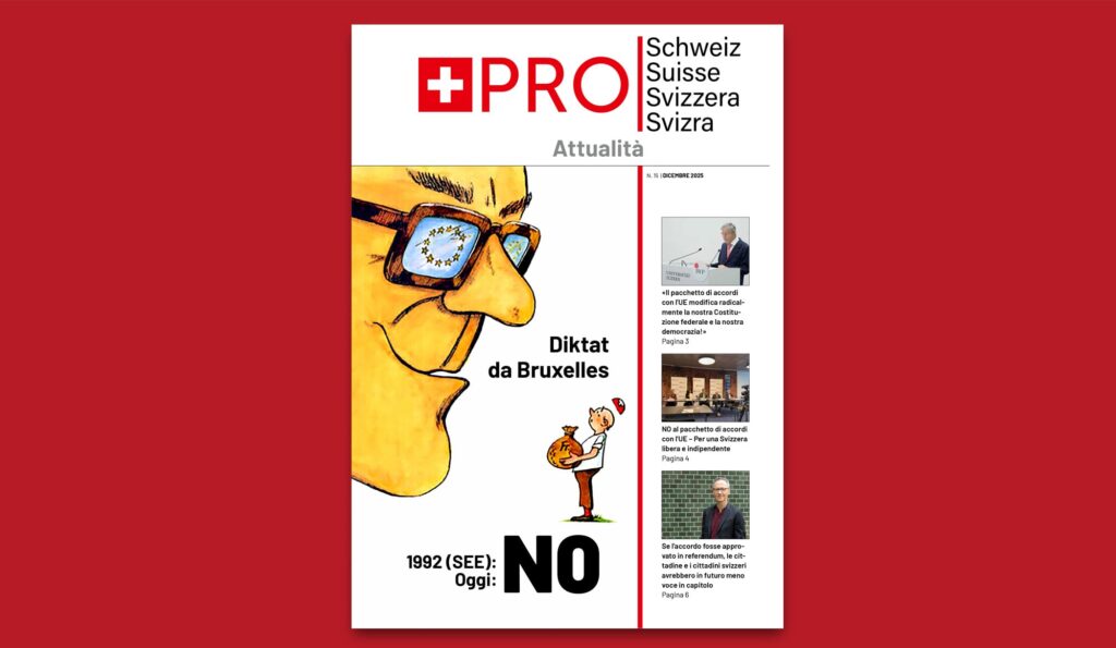 Berna, 27 ottobre 2025 – Il movimento apartitico Pro Svizzera respinge con fermezza il previsto pacchetto di accordi con l’UE. I trattati limiterebbero massicciamente la Svizzera nella sua libertà d’azione, nell’autodeterminazione democratica e nell’autonomia economica.